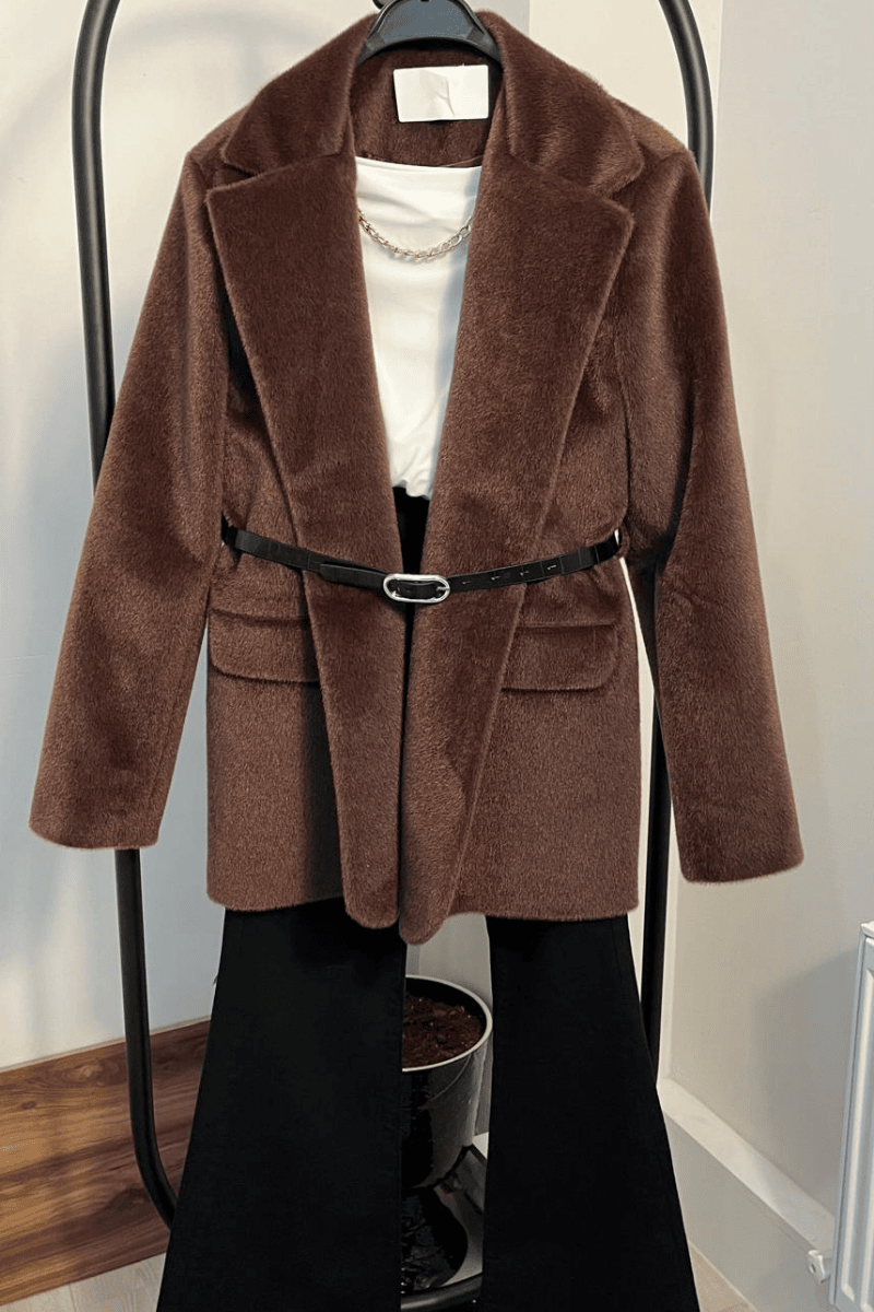ELLİZZ KADIN ACI KAHVE KEMERLİ TÜYLÜ ORTA BOY CEPLİ KABAN